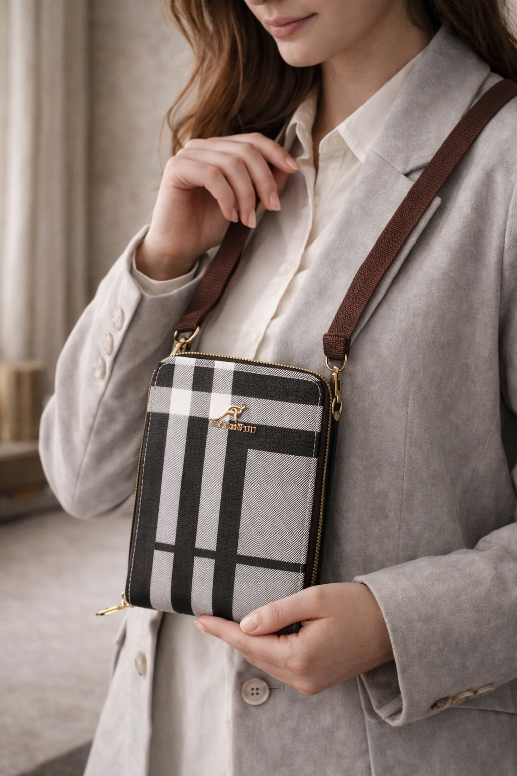Elegant Essence, a sophisticated accessory that effortlessly blends luxury with practicality. This handbag features a timeless design in rich, deep brown with a signature geometric pattern, offering a refined and polished look. The gold-toned hardware and subtle logo detailing elevate the overall design, adding a touch of class. The bag comes with an adjustable strap for ease of use, and the sleek zipper closure ensures that your essentials are secure while on the go. Whether you're out for a casual day or a special evening, Elegant Essence serves as the perfect companion, adding a dash of elegance to your ensemble.